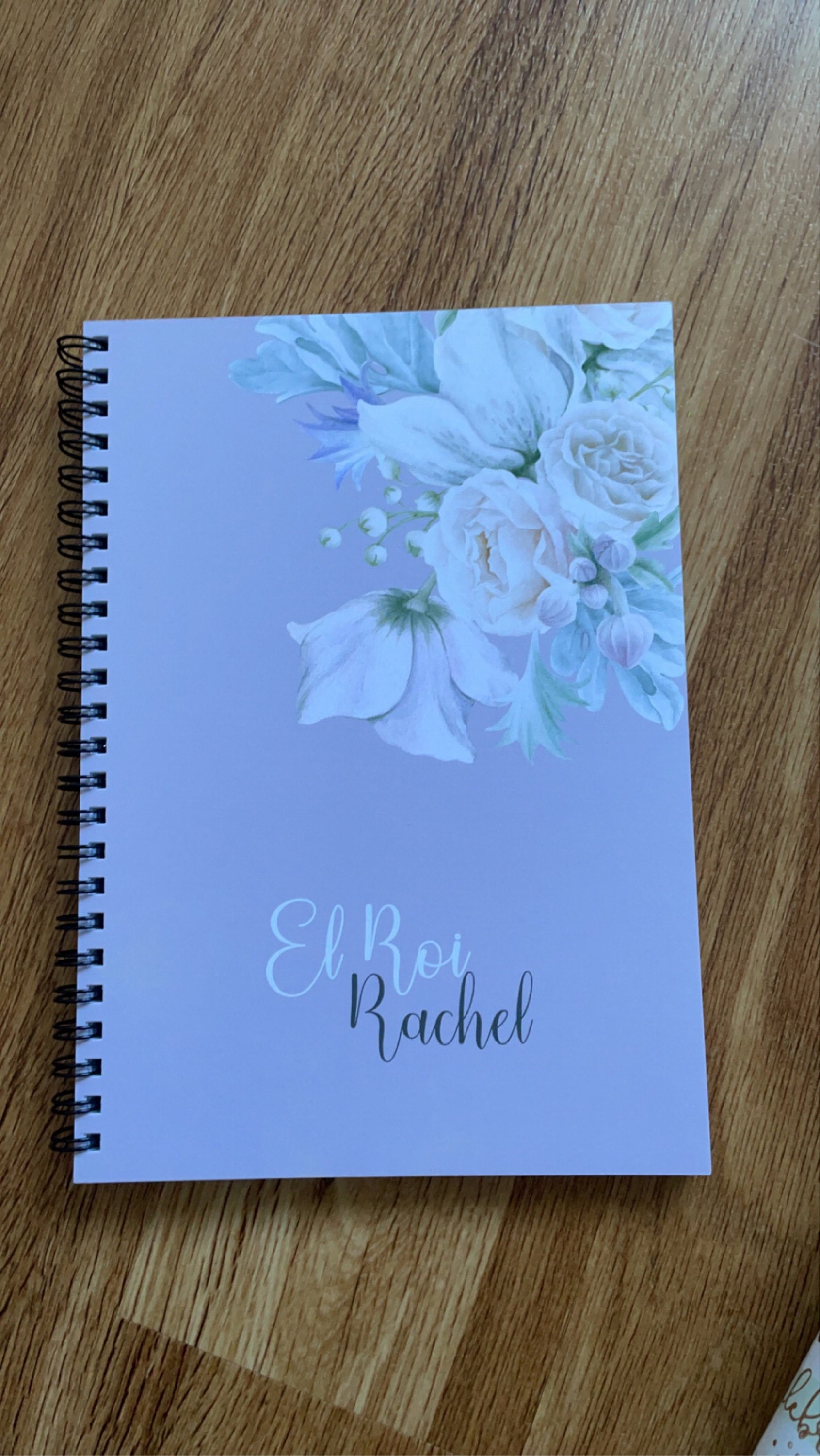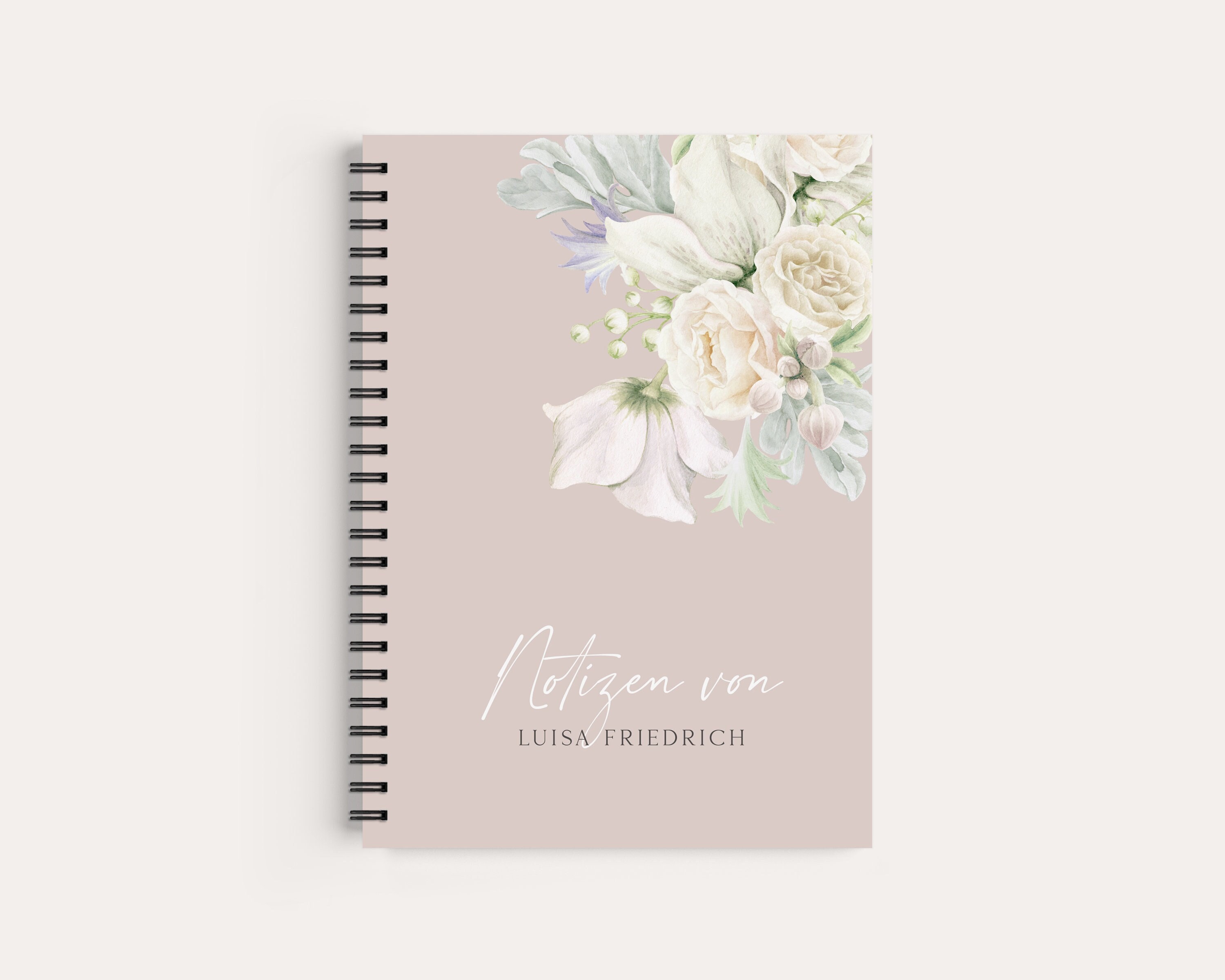 The cover is made of 300gsm designer cardstock with white flowers and can be customized to your liking. You can see a selection of fonts in the last product image. A logo or other graphics can also be printed, making the book a personal and personalized gift.
