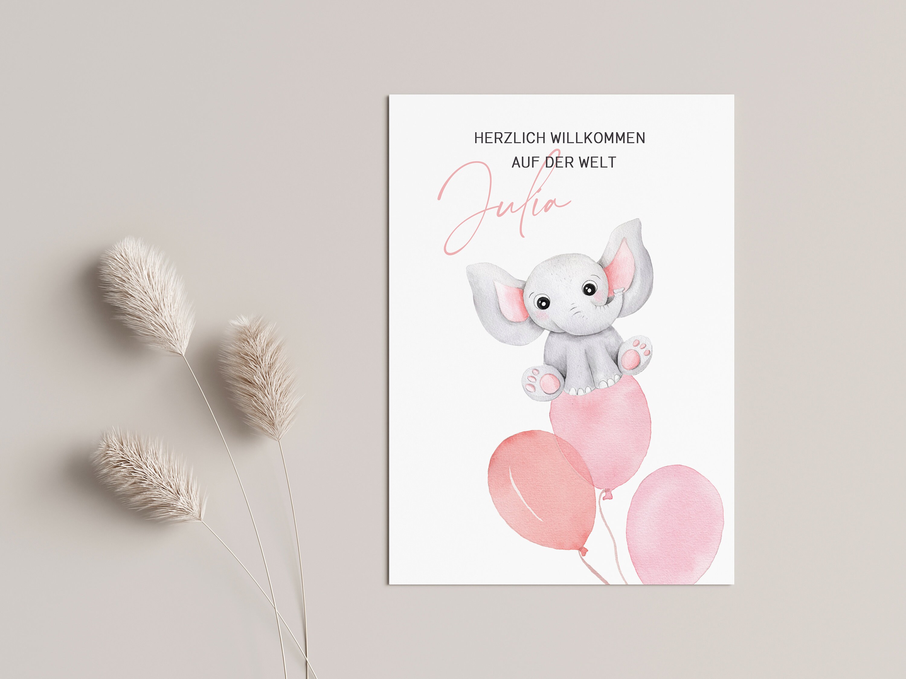 Folding card "Elephant with pink balloons" personalized with name - congratulations card for birth.