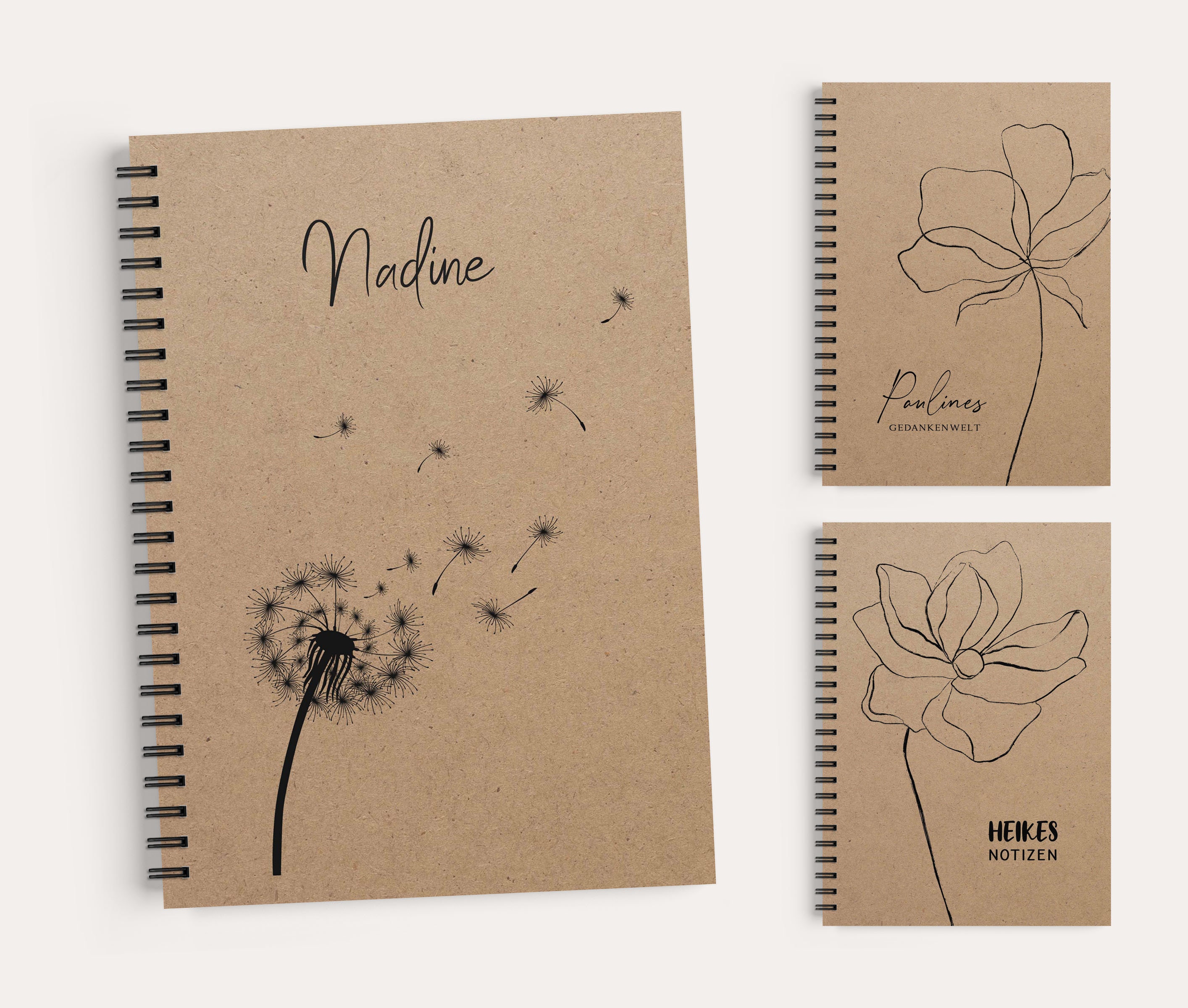 Dieses handgemachte Notizbuch im Format A5 wird mit Liebe gefertigt und ist ein echtes Unikat. Das stabile Kraftpapier-Cover (300 g/m²) mit floralem Motiv – wähle zwischen Pusteblume, Rose oder Blüte – macht dein Buch zu einem ganz persönlichen Begleiter.