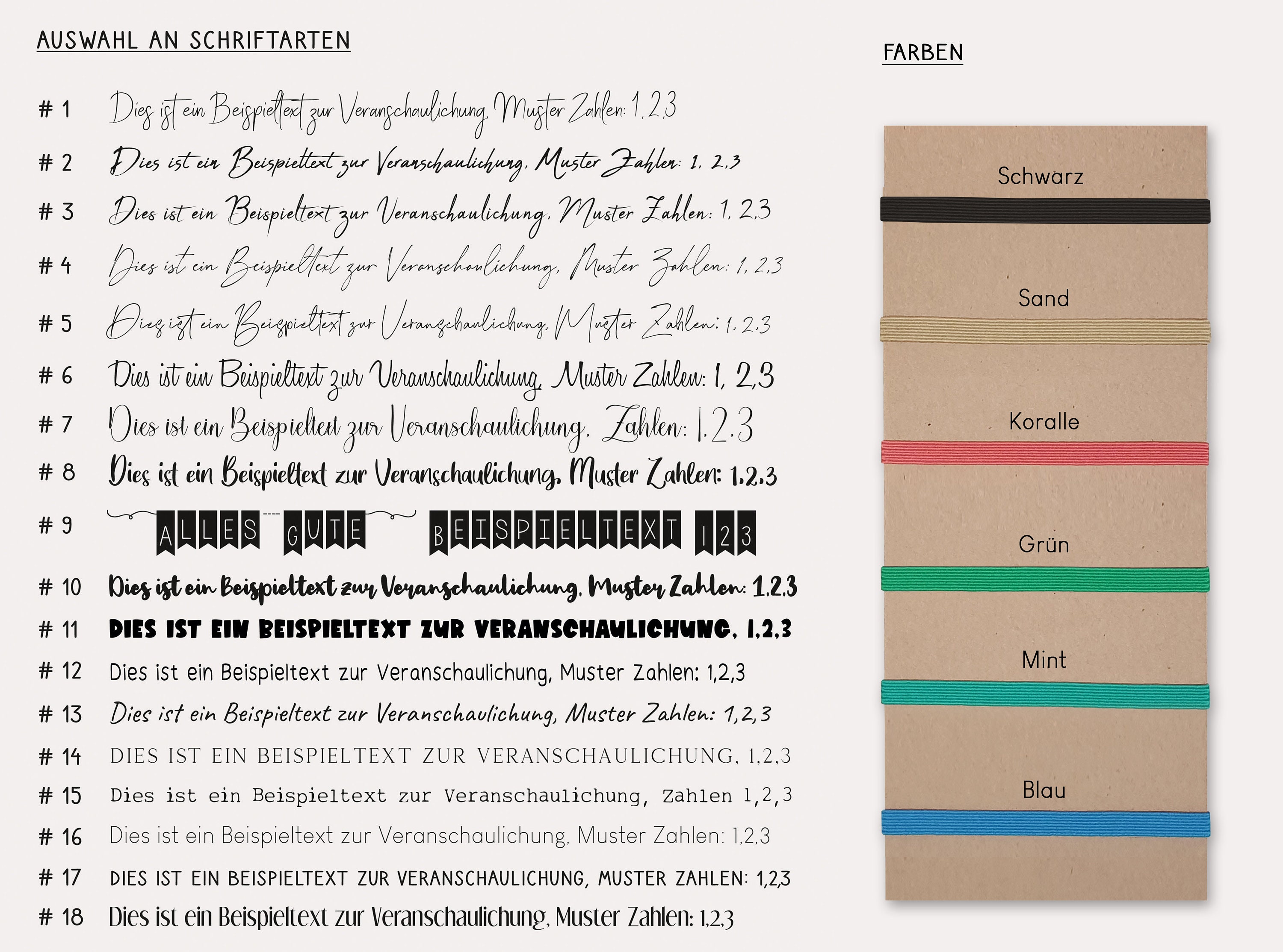 There are several colors for the elastic closure, as well as a selection of fonts (see last photo). I always send a print preview before production.