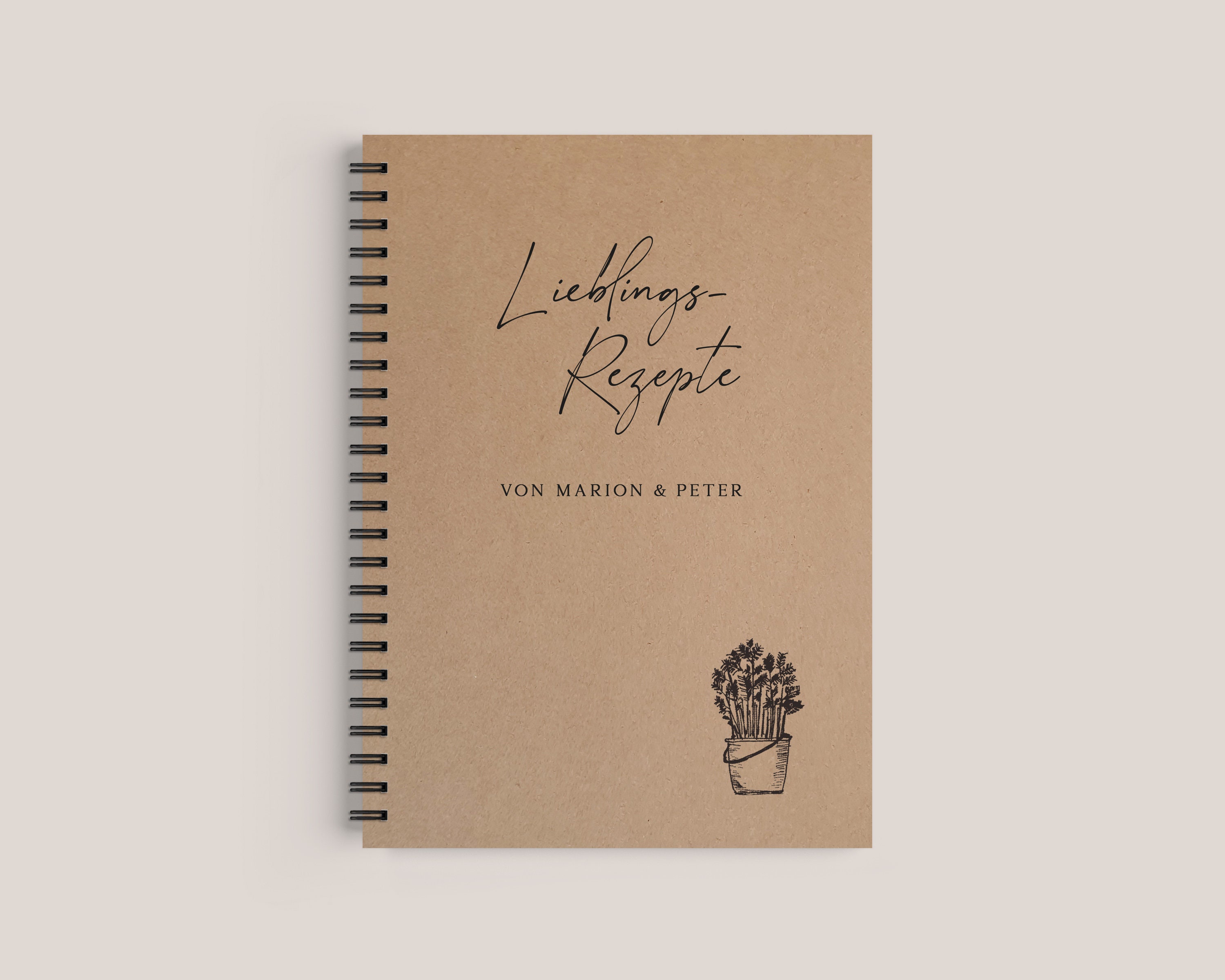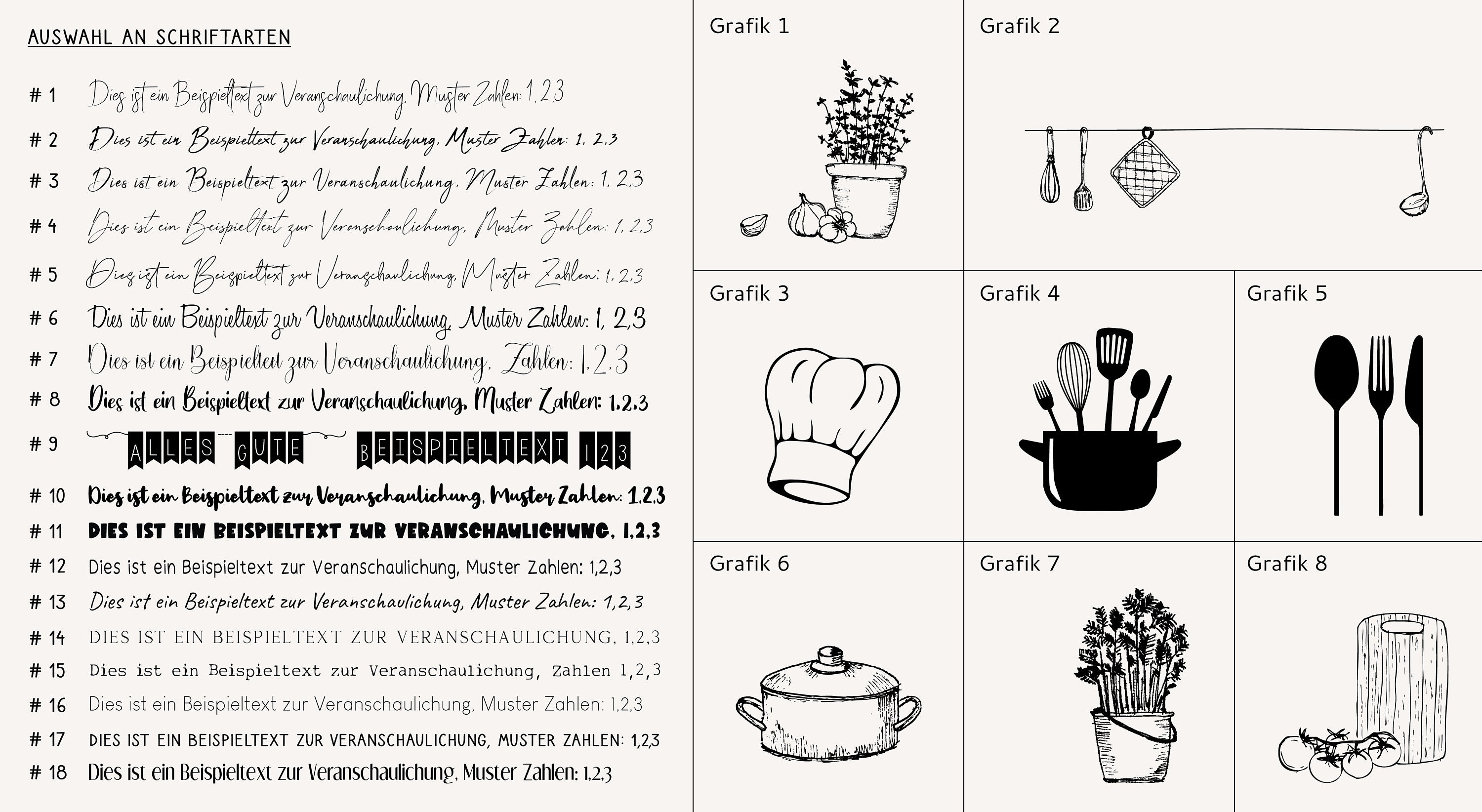 The cover is made of 300g/m² cardboard in various colors and can be customized to your liking. The recipe book is protected by a transparent cover film. The back is made of high-quality 2 mm thick, solid black cardboard, which ensures stability. You can see a selection of fonts in the last product image. Logos or other graphics can also be printed. This makes the recipe book a personal and personalized gift – for family, for a wedding, a birthday – or simply for yourself.