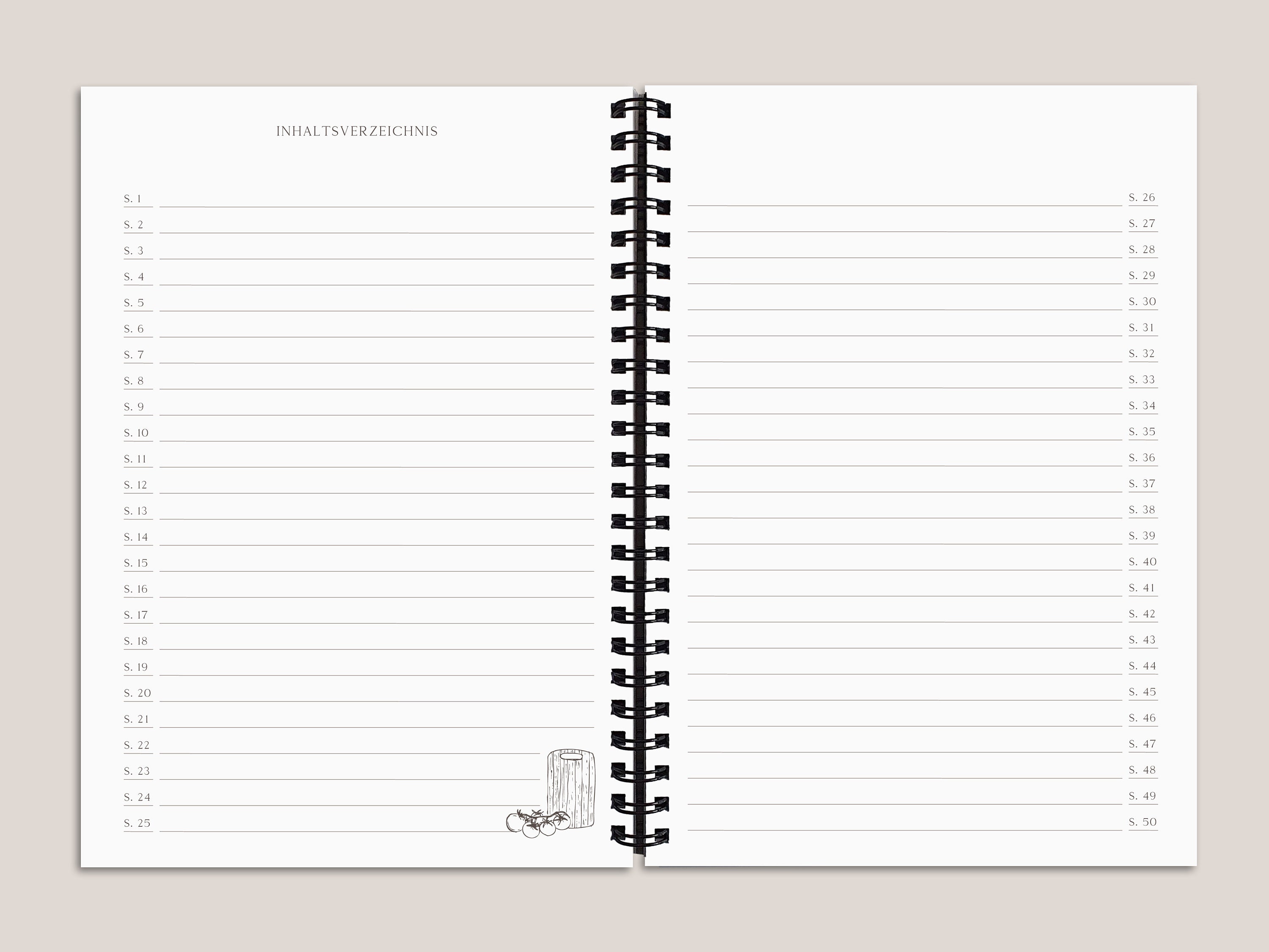 The inside pages have an ideal thickness of 160g/m² and are preprinted, allowing recipes to be entered quickly and clearly. There's a practical index on the side. The recipe pages are all numbered. The table of contents provides a quick overview, eliminating the need to search for them. There's space for 50 recipes in total.