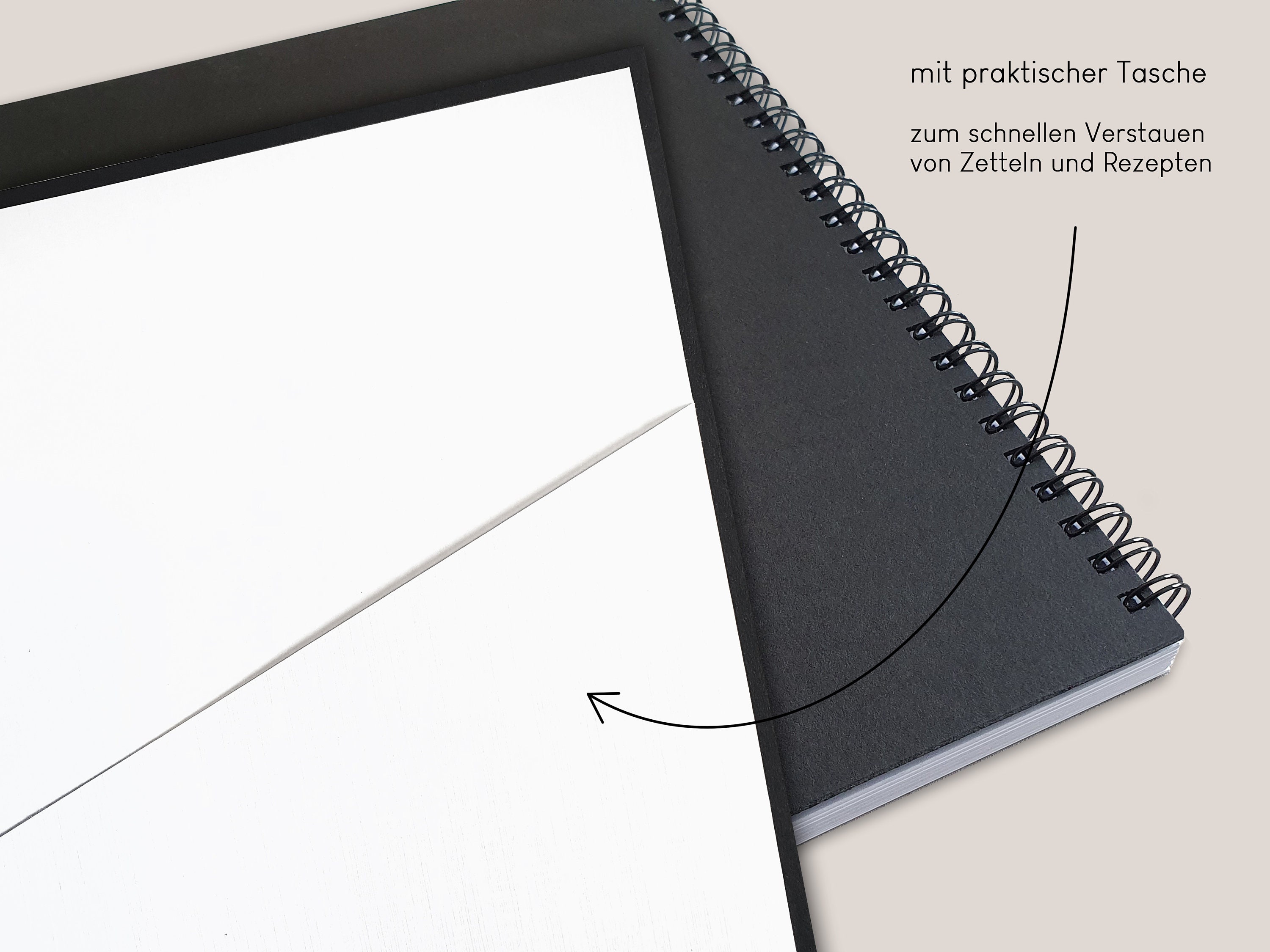 The practical insert pocket/paper compartment at the back helps you store notes and cut-out recipes until you've written them in. The ring binding ensures the recipe book always lies flat and can be easily placed on the wall, taking up no space on the kitchen countertop while cooking and baking.