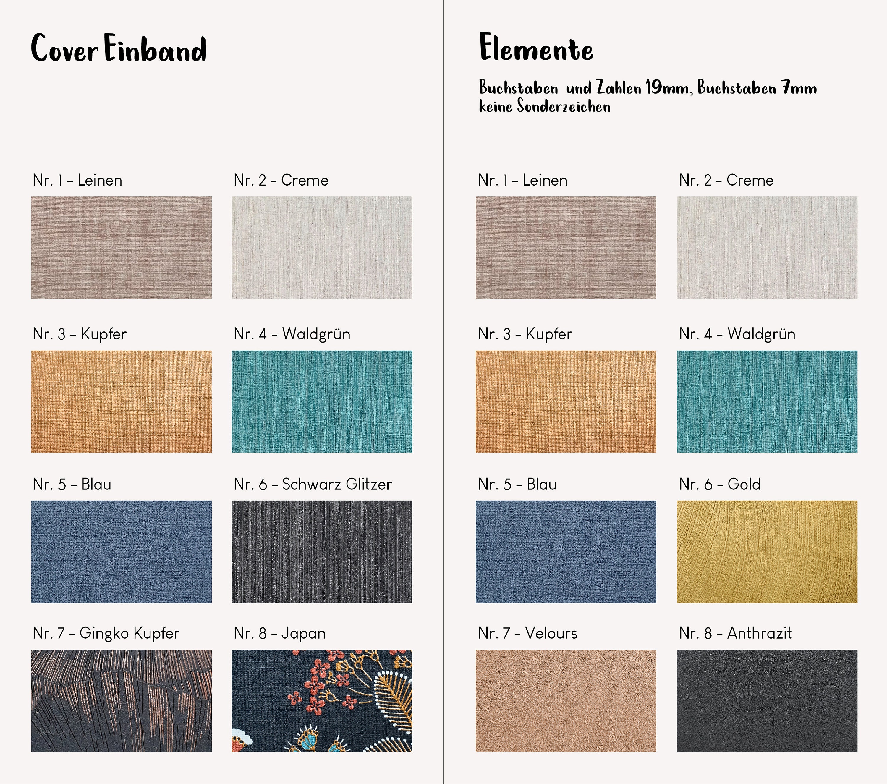 The high-quality hardcover is bound with a linen-like textile binding, available in a variety of colors. The cover is approximately 2 mm thick, sturdy and durable, and can even be wiped clean with a damp cloth.