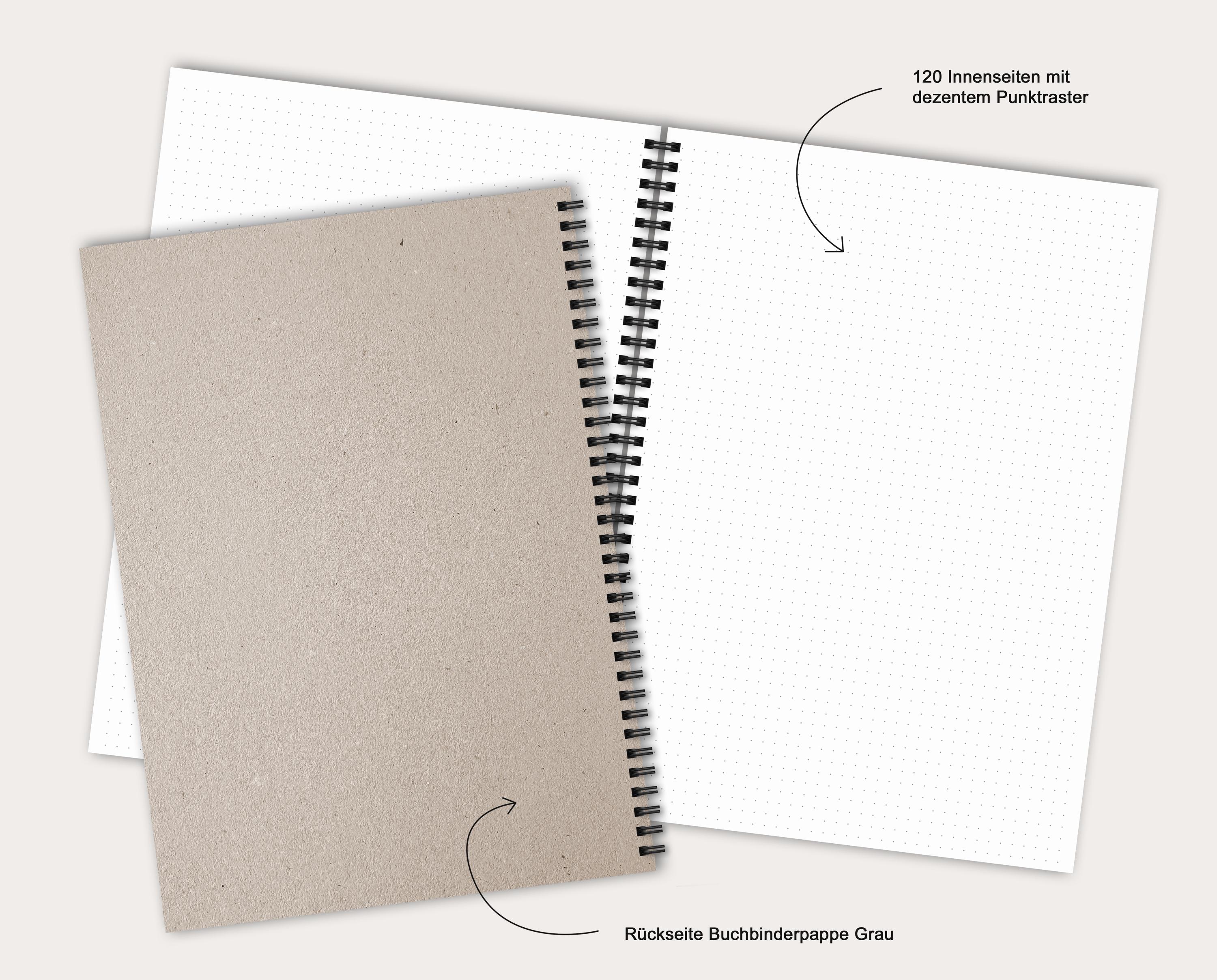 The metal ring binding ensures the book lies flat and turns pages easily—perfect for writing, sketching, or planning. Inside, you'll find 120 pages with a delicate dot grid (5 mm spacing) that remains discreetly in the background, leaving plenty of space.