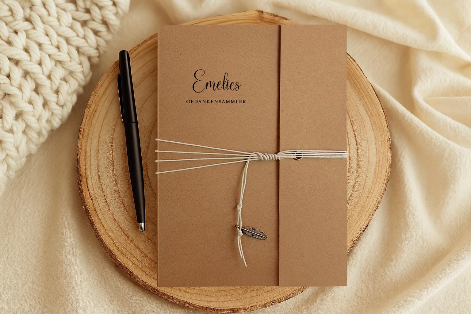 Each book is unique. Here you will receive a personalized notebook with a softcover made of kraft paper (300 g/m²) and a drawstring closure. The drawstring is made of high-quality, lightly waxed cotton ribbon in various colors and is adorned with a small metal nib. The inside pages are bound with a metal ring binder, ensuring the book always lies flat and is easy to write in. This book can be used as a journal, for confirmations, weddings, or as a personalized guest book. It is a truly unique gift that will bring joy to others and, of course, to yourself.