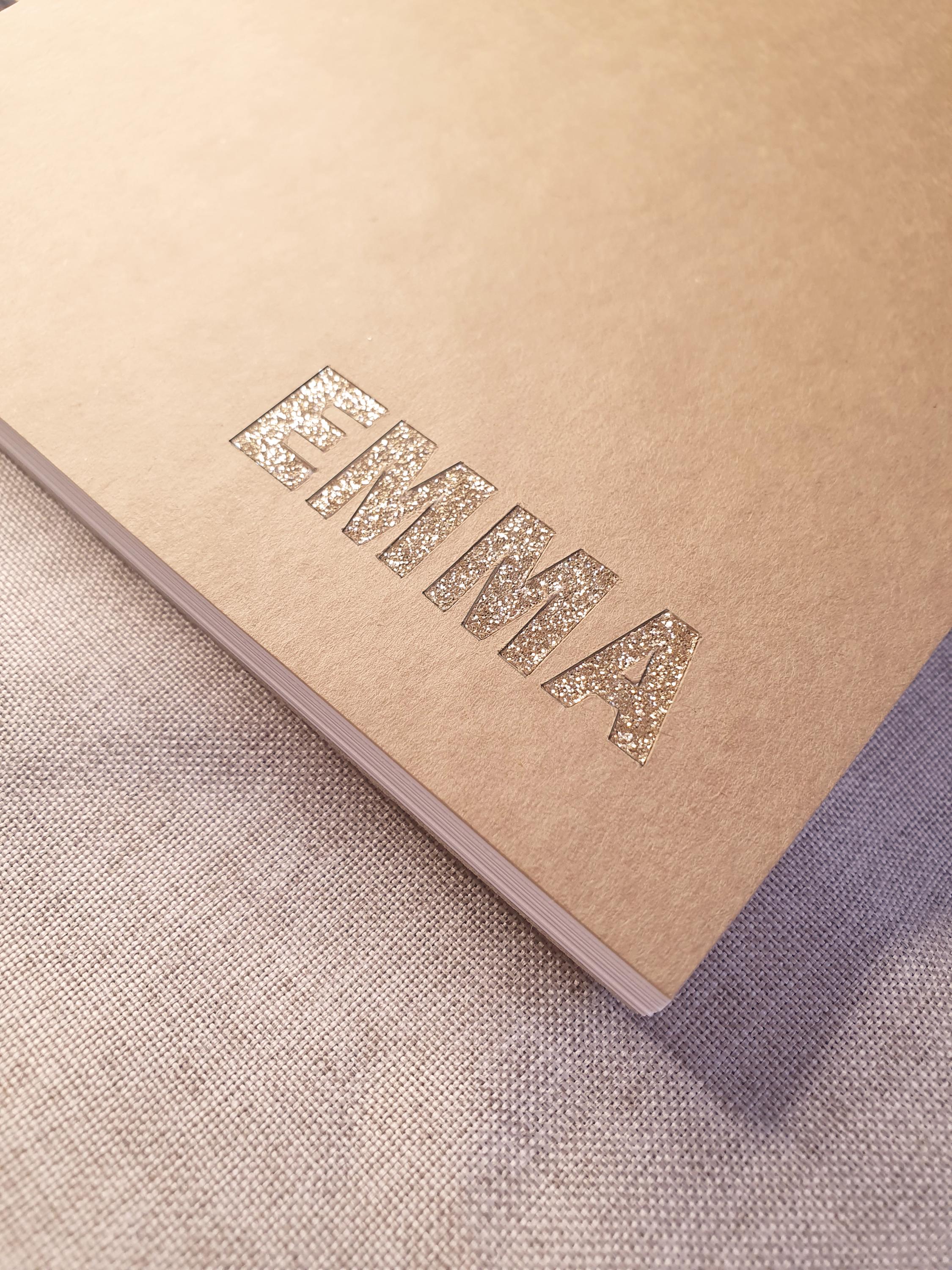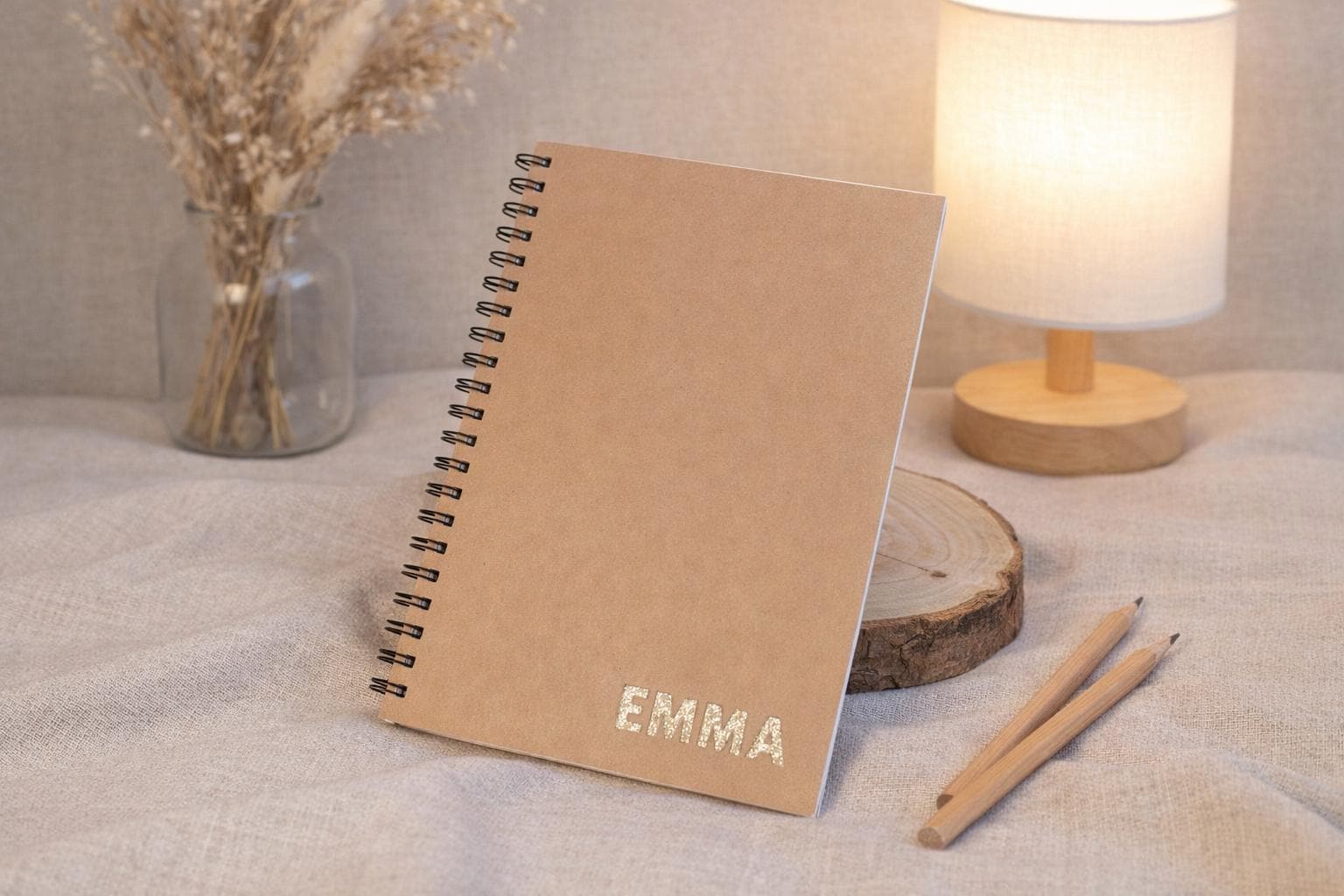 This ring-bound notebook is truly special. Double-cut letters or numbers create beautiful glitter inlays, seamlessly integrated into the cover. The personalization sparkles and shines in the light. A unique gift, or your own elegant personal journal or sketchbook.