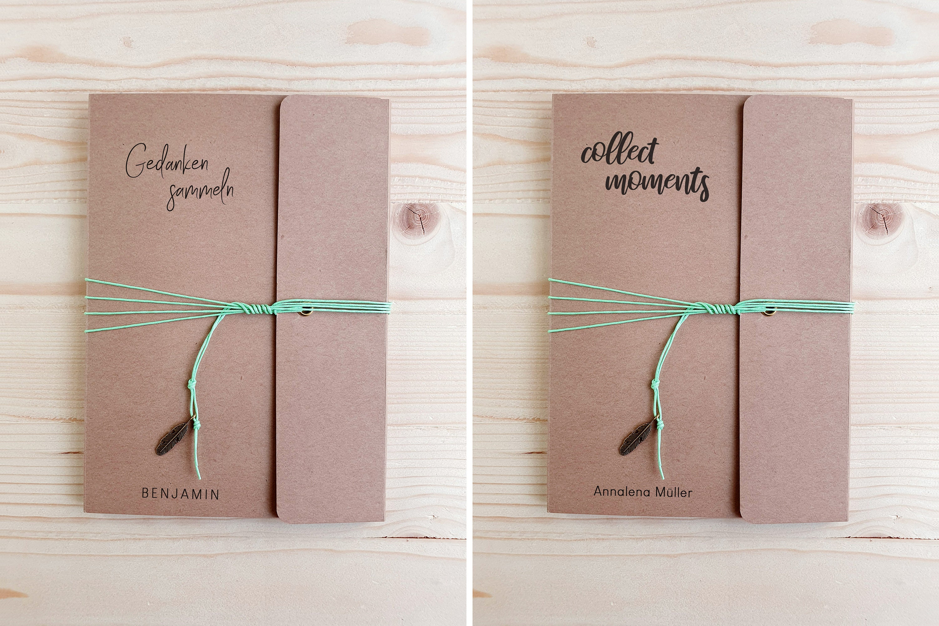 Each book is unique. You will receive a personalized notebook with a soft cover made of kraft paper (300gsm) and lacing. The lacing is made of high-quality, lightly waxed cotton cord in various colors and is decorated with a small metal spring. The inside pages are closed with a metal ring binding, so the book always lies flat and is easy to write in. This book can be used as a journal, for confirmation ceremonies, weddings, or as a personalized guest book. It is a unique gift that will bring joy to others, as well as to yourself.