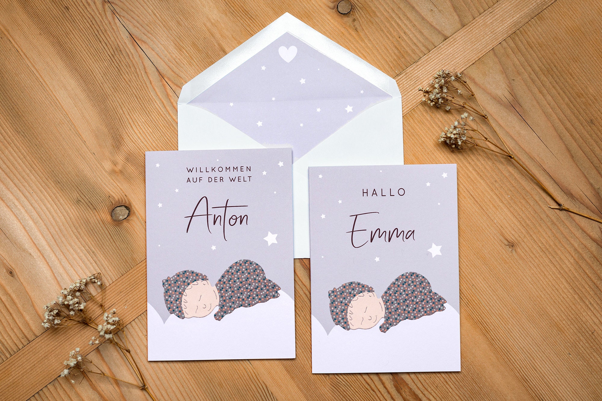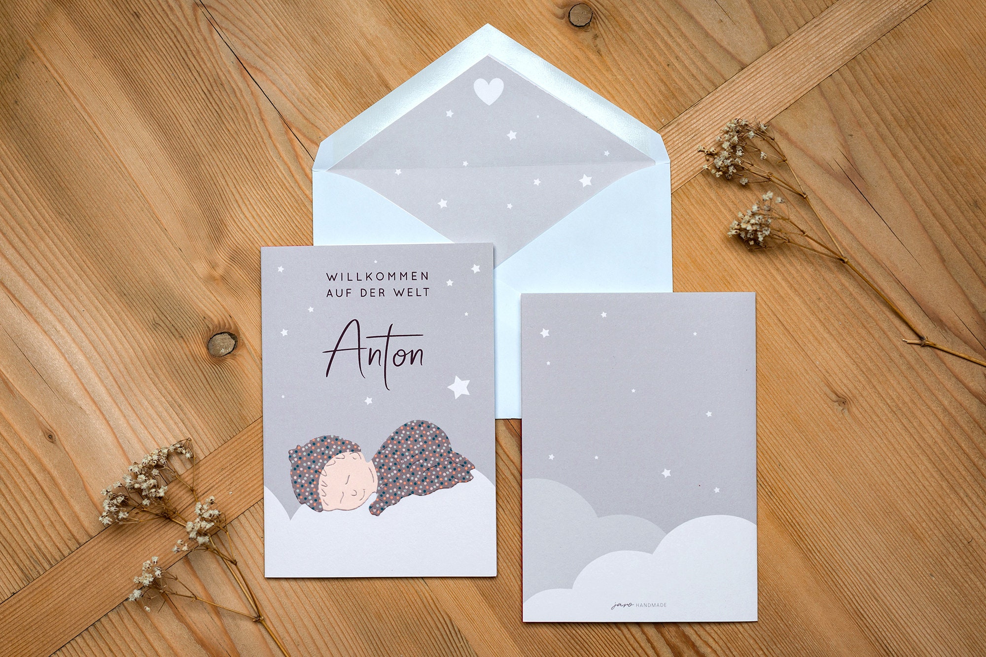 This loving card for new parents is designed in delicate (warm) gray and white tones and features a subtle color scheme. The baby on the cloud is not just printed but also glued as a die-cut piece. The card is suitable for both girls and boys.
